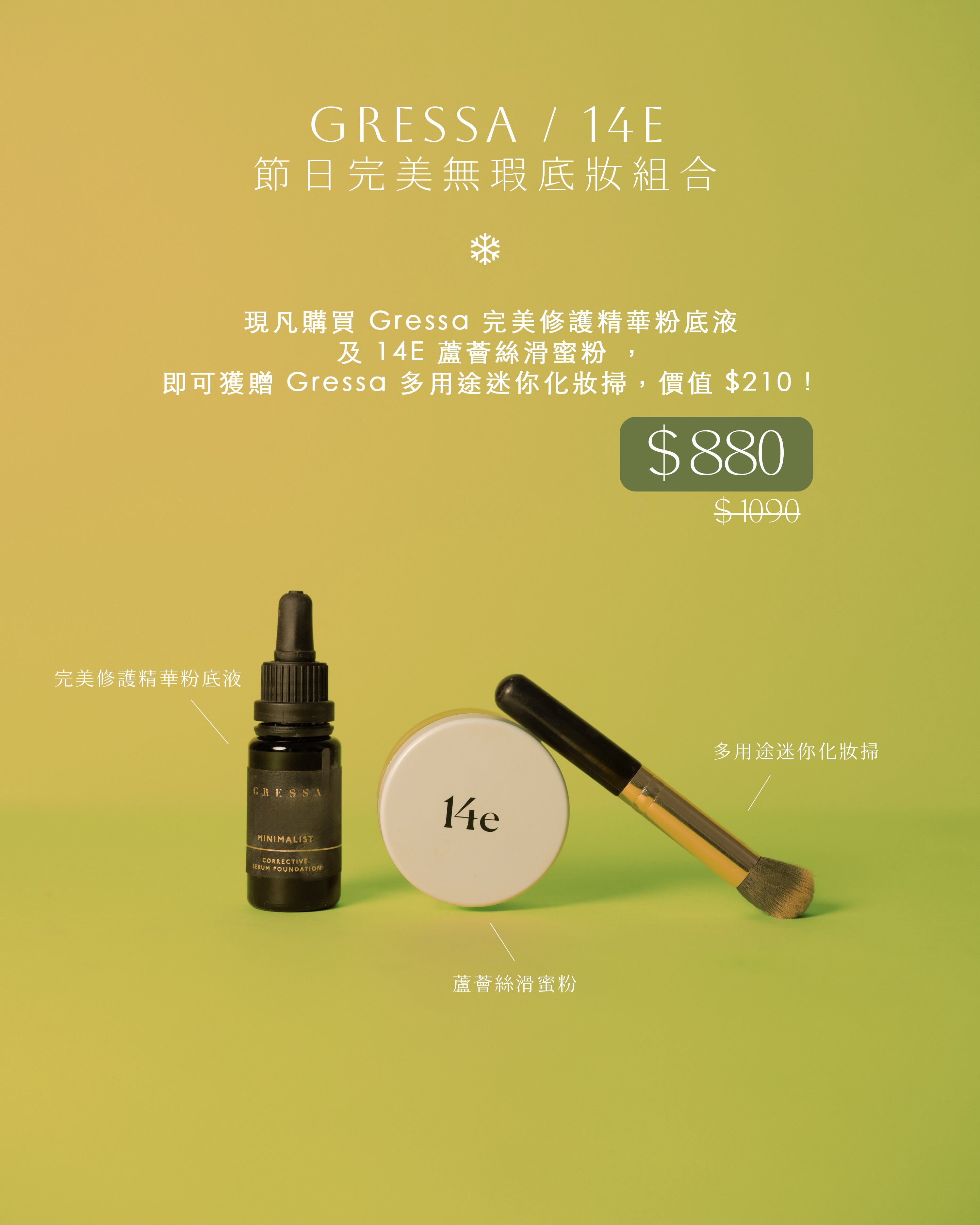 🎅🏻 現凡購買 Gressa 完美修護精華粉底液 及 14E 蘆薈絲滑蜜粉 ,即可獲贈 Gressa 多用途迷你化妝掃 乙枝,價值 $210! 開業至今,14E 蘆薈絲滑蜜粉 和 Gressa 精華粉底液 一直佔據 Beautysaur 銷售榜冠軍寶座,從未動搖過!今個聖誕繼續有 Gressa 同 14E 幫忙,讓我們擁有貼服底妝外,更送出 Gressa 多用途迷你化妝掃,選用 100%純素植物纖維,可專業地將粉底遮瑕均勻推開,亦能用作胭脂、眼影掃,設計小巧設計便於攜帶,隨時補妝無難度! *Gressa 精華粉底液 將於 2026年1月1日 起加價至 $880,襯住今次機會快啲團貨啦!(全新批次到期日為2028年) Gressa 完美修護精華粉底液 顏色簡介:...